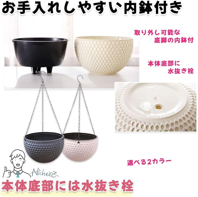 【商品内容】ハンキングバスケット(2個セット) 材質:樹脂 カラー:オフホワイト/ダークグレー サイズ:上部直径/約16.5cm底部直径/約7.8cm 深さ/約11cm チェーン長さ/約46cm