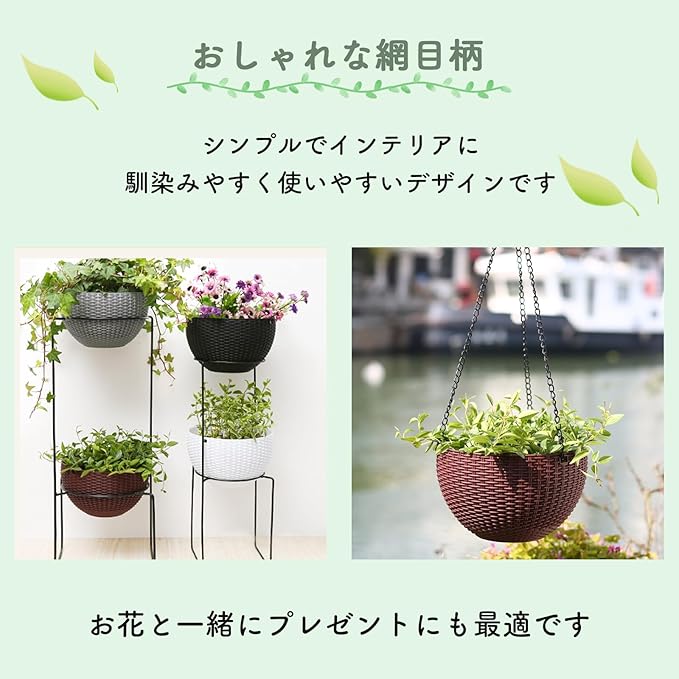 「高い通気性、底穴栓付き」植物の腐食を防ぐ高い通気性、水分調整の出来る水はけの用の底穴栓付属で屋内でも使用可能です。チェーンが取り外し出来床置きが出来ます。お花と一緒にプレゼントも喜ばれます。観賞植物はもちろんインテリア性に優れてますのでお部屋のリモコン等の小物収納にも最適です