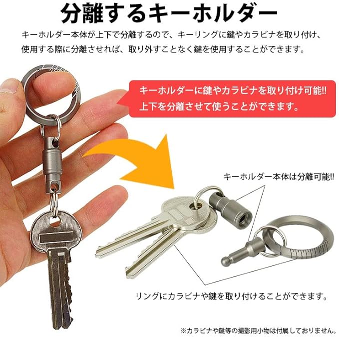 鍵やカラビナを取り付け、使用する際に分離させれば、取り外すことなく鍵を使用することができます。