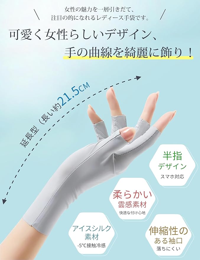 [PALAME] 手袋 レディース 夏 UVカット 【柔らかいアイスシルク素材・-5℃冷感・UPF50+認定品】 春 秋 UV手袋 紫外線対策 日焼け防止 指なし 半指 細かい作業 上質な肌触り 超軽量 極薄 通気性 速乾性 手荒れ対策 通勤・自転車・運転用