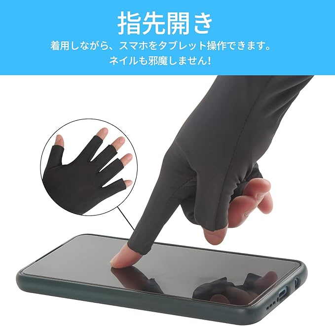 指先開き:指先部分だけ空いています。着用しながら、スマホをタブレット操作できます。ネイルも邪魔しません!