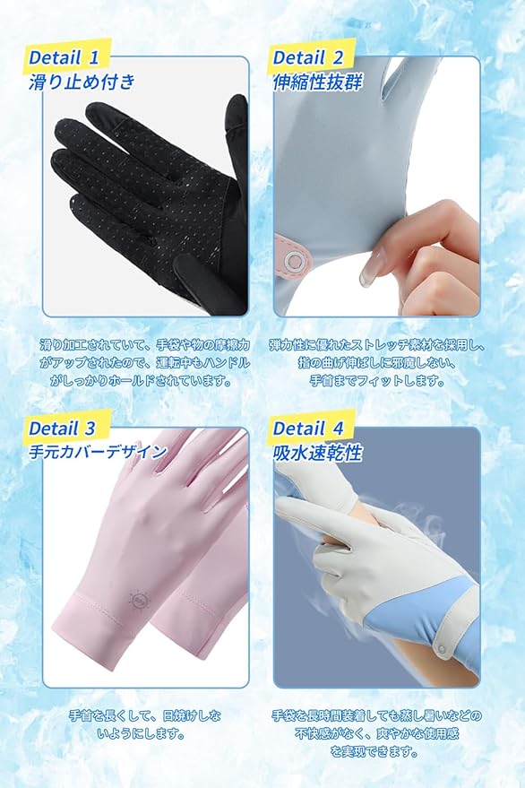 【2本指出しスマホ操作に対応】UV手袋 レディースは親指と人差し指の指先部分を出せる設計を採用し、手袋を付けたままスマートフォン、タブレット、カーナビに操作できて便利です。ガーデニングなど細かい手作業の時にも便利なレディース 手袋です。手のひらには滑り止め付きますので、運転や自転車などにも対応できます。しっかりハンドルが握られて、安全性も高いです。