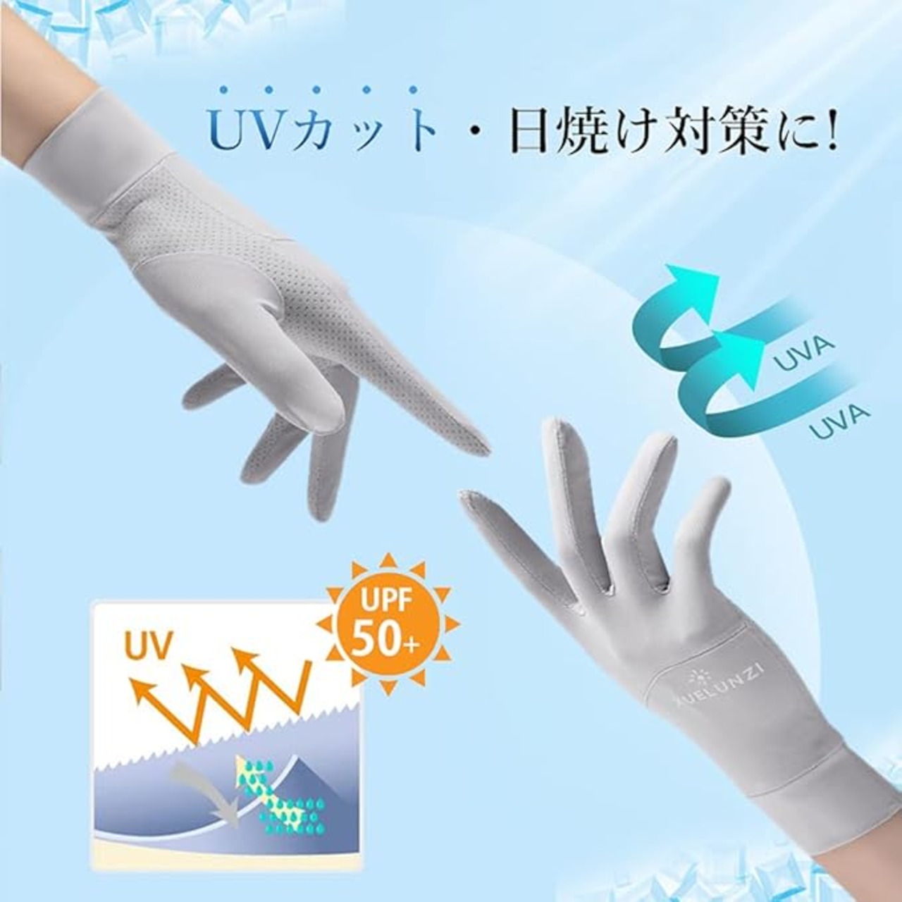 【夏にうれしい冷感素材】冷感素材を採用して、水や汗で濡れると気化熱の作用により冷却効果があり、タッチすると涼しい感じがします。春夏にピッタリのUVカット手袋です。 吸湿性、放湿性も優れているので、蒸れなくサラサラとしたつけ心地で夏でも快適ご使用いただけます。