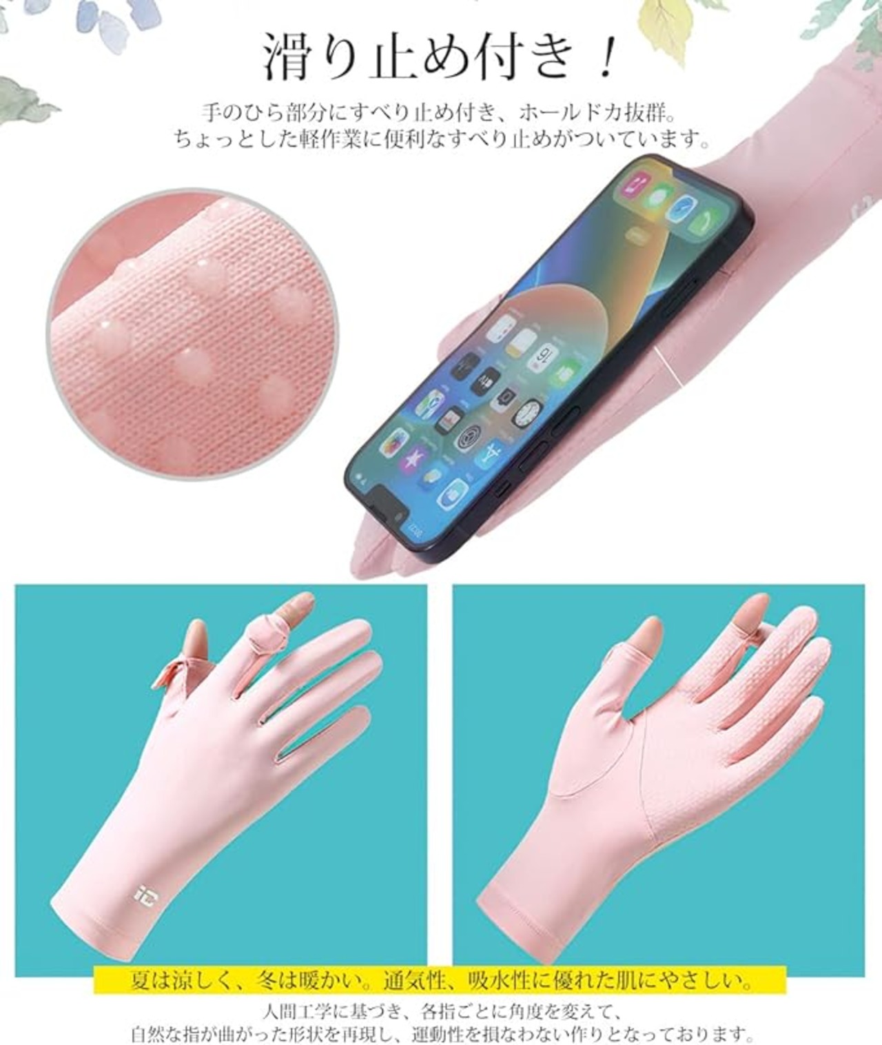 【-5 ひんやり冷肌触感・真夏でも手の涼を感じる】-5 究極のひんやり冷肌の生地を使用し、手袋付けて肌と接触した瞬間にすずしい涼感が感じられて、蒸れずに快適!通気性に富み、涼しさが持続して、汗を吸っても散発性がある事で雑菌の繁殖を抑え、臭いも抑えます。夏日焼き止めの第一選択夏保湿ケアUV手袋です!