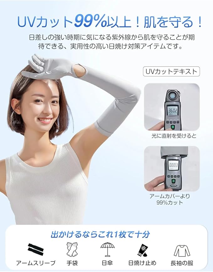 【指先まで紫外線カット】手のひら部分は指先までの手袋の設計でほかの手の甲までのタイプと違って、腕から指先まで紫外線から守ります!さらに親指と人差しの指先部分も着脱可能でスマホの操作など指先の細かい作業も楽々!腕から手袋着脱可能、ちょっと手を出したい時は便利!アームカバーを外さなくて作業可能!蒸し暑いの夏でより快適に紫外線カット!