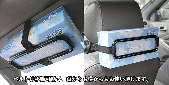 車用、ティッシュボックスホルダーです。サンバイザーやヘッドレストに簡単に装着できます。