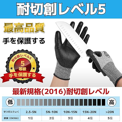 【レベル5切削防止】 EN388認定の最高レベル(レベル5)の切削防止性能である高性能切削防止材HPPEを使用し。セキュリティ、アウトドア、園芸、段ボールの解体、ガーデニング、機械加工、車の修理、ガラス、建設、取り扱い、運転、大工、草切り、DIY、廃棄処理、実験、地震救援防災など幅広くご使用いただける作業用軍手。