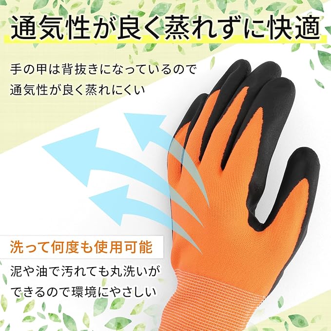 【通気性が良く蒸れにくい】作業用手袋は手の甲が背抜きになっているので、通気性が良く蒸れずに快適です。洗って何度もご使用できます。