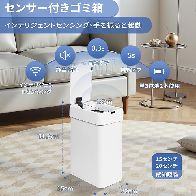 【隙間に置ける】幅15 cmとコンパクトなので、省スペースの隙間にも簡単に置けます、限られたスペースにも対応し省スペース!リビング、寝室、オフィス、書斎など、スペースに合わせてお選びいただけます。さらに、18cmの開閉口径により、ゴミの処理がより簡単かつ便利なものになります。