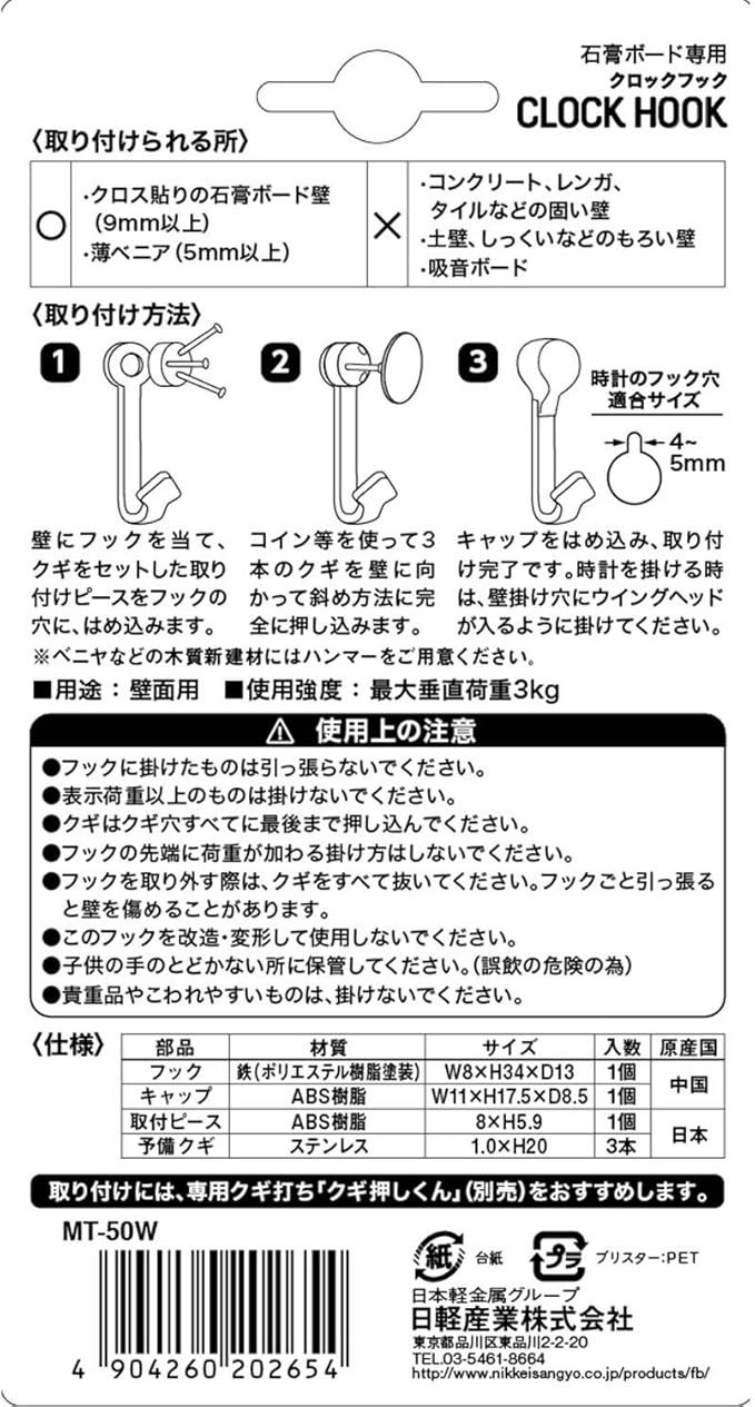 取り付けられる所:クロス貼りの石膏ボード壁(9mm以上)、薄ベニア(5mm以上)(ベニヤなどの木質新建材にはハンマーをご用意ください)