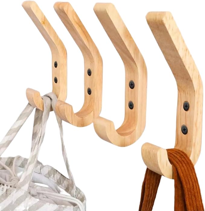 【木製壁掛けフック4個セット】木製かつ北欧風のJ字壁掛けフック4個セットです。耐荷重は15kgでジャケット、コート、マフラー、帽子など収納できます。