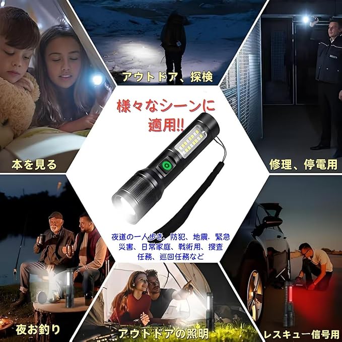 【便利なズーム式&高耐久性】本懐中電灯は伸縮式のフォーカスレンズを搭載して、ヘッドを引っ張り光の焦点距離と照射範囲を調整でき、ニーズに応じてご利用可能。今まで夜間の安全に困っていたお客様にお勧め。本懐中電灯は軍用アルミニウム合金ケースは、耐衝撃性に優れ、3メートルの落下にも耐えられ、防災や自衛などに使用可能です。宇宙用アルミ合金を採用し、材質はブラスト酸化処理によるもので、落下防止の高さは1m、耐衝撃性は4kgです。アウトドア・キャンプ・登山・防犯・防災・地震対策・停電時などに大活躍しています。