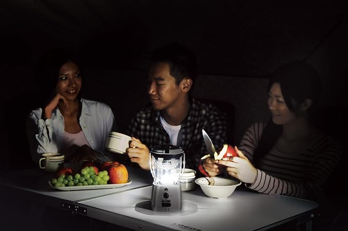 電源がないところでも手巻きで使える電池不要のランタンです。電源は手回し充電、AC100V、DC12Vの3つが選べ、どのうような状況にも対応。携帯電話の充電もできます。キャンプ時のリビングスペースでテーブルを囲んだ4人の中心に置き、相互の表情がわかる明るさを確保します。