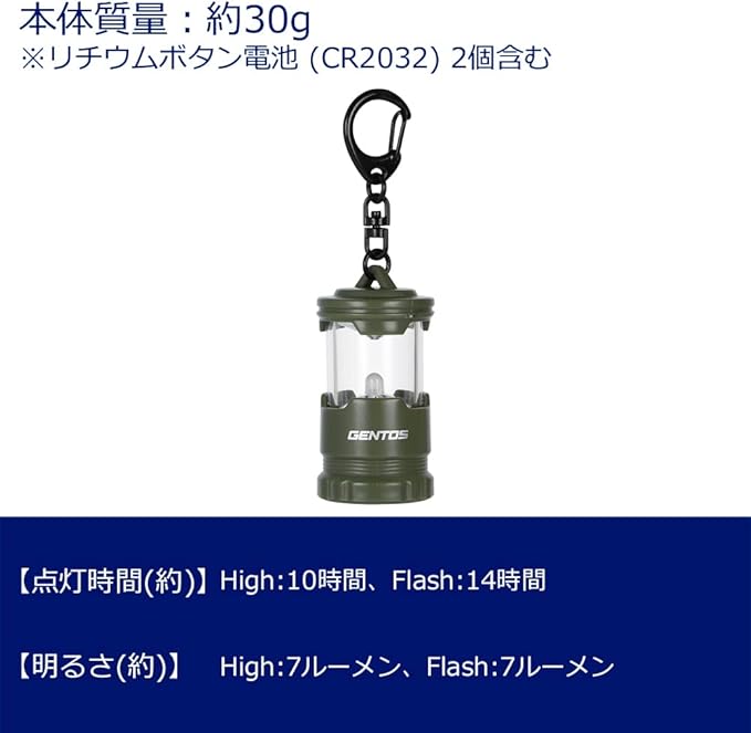 明るさ(約):High/7ルーメン、Flash/7ルーメン、使用電池:CR2032 2個