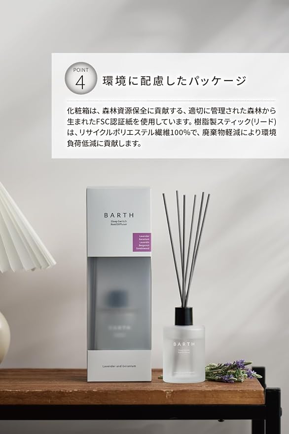 心地よい睡眠空間をつくるアロマSleepSwitch*と、天然精油をBARTHオリジナルのバランスでブレンドしたリードディフューザー