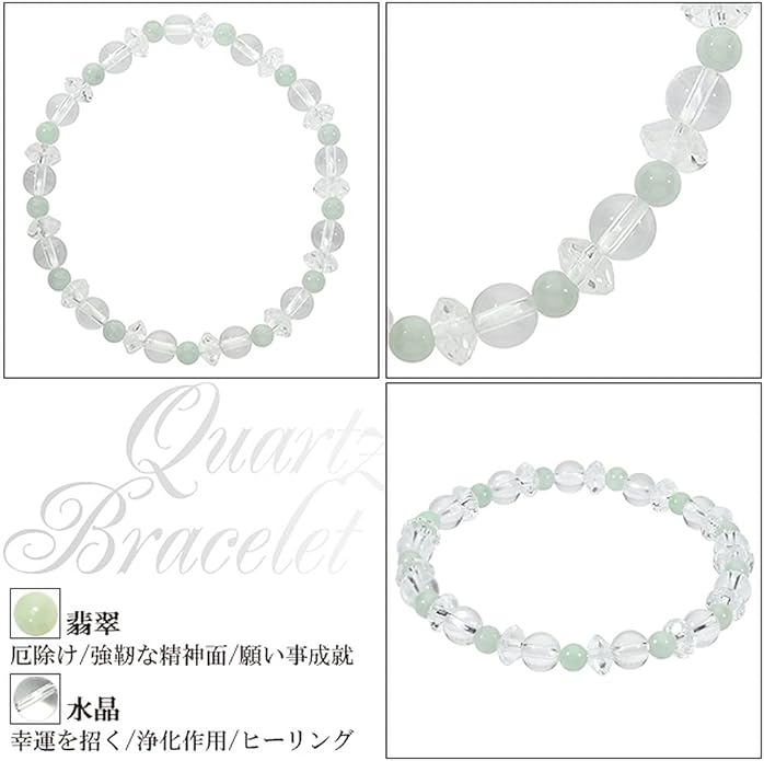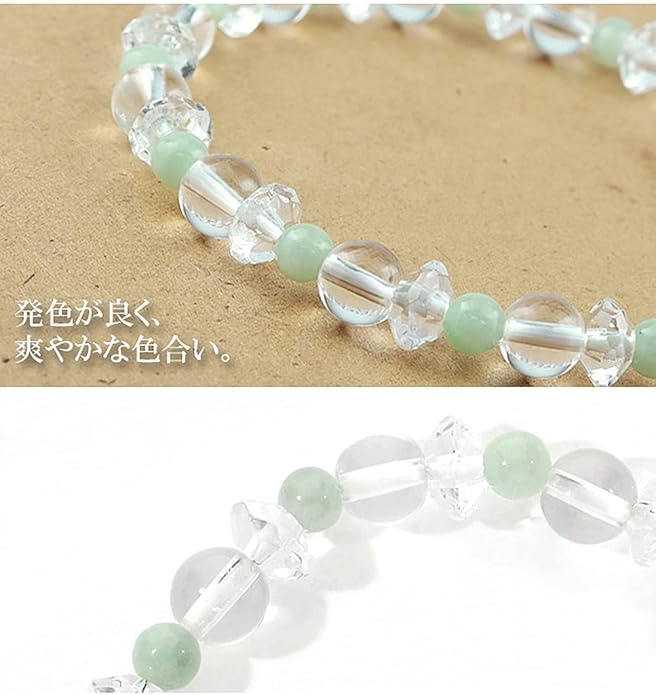 商品データ・長さ 約16.5cm(レディースSサイズ)・本翡翠 約4mm 13玉・水晶 約6mm 13玉・平カット水晶(小) 13玉・ポリウレタンゴム使用