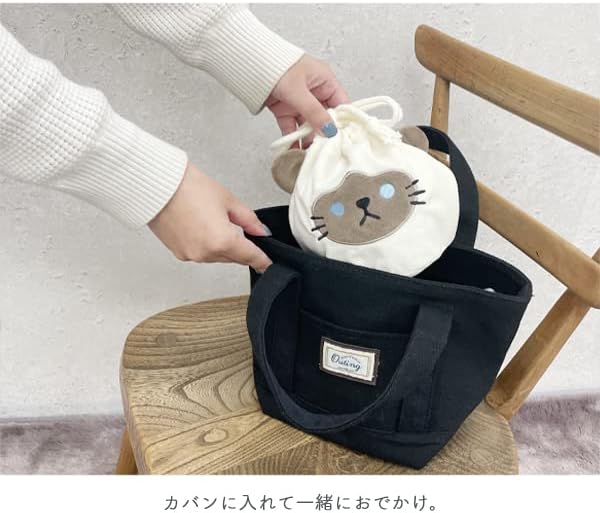 肌触りのいいベロア生地にかわいい動物デザインの巾着です。 たくさん入れて形を整えるとまん丸になりぬいぐるみのよう。 お菓子、携帯の充電器、リップ、メイク道具、ヘアアクセサリ、 お薬、学用品、ハンカチ…など細々したものを入れるのにぴったり。 持ってるだけで楽しい気分になりそうな巾着です。