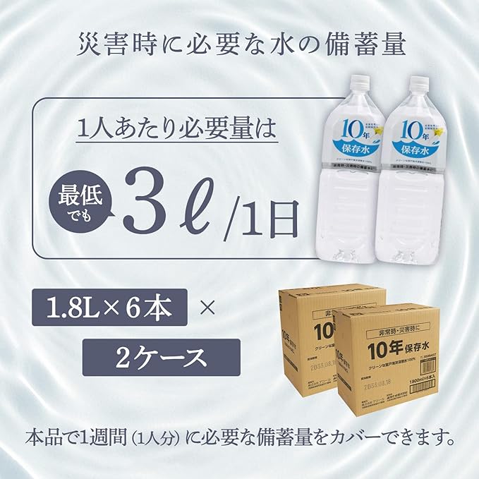 【なぜ"10年"保存できるのか】耐熱の頑丈なペットボトルを使用しており、厚みのあるペットボトルの為、蒸散を防ぎ10年保存ができます。災害対処用として、万が一の事態に備えておきましょう。この保存水は災害時に壊れにくい段ボールを使っているので、備蓄用としてお使いいただけます。