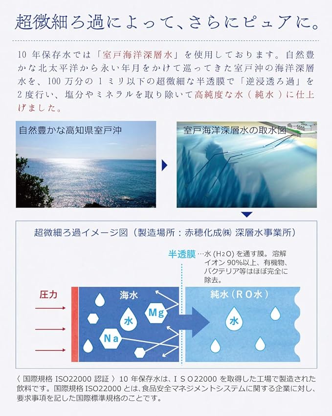 【硬度0の純水で安心】硬度0の純水(室戸海洋深層水)の非常災害備蓄用飲料水ですので、赤ちゃんのミルク作りや、お薬服用時など、場面を問わずに安心していつでもお使いいただけます。非常時用にこそ、どんな場面でも使える「10年保存水」は多くの方に愛されております。
