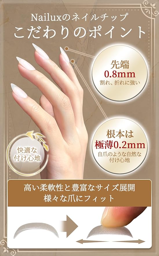 ✅【先端と根本で異なる薄さ】根本は超薄0.2mmで自然な付け心地。先端は0.8mmにしチップの欠けや割れ防止。