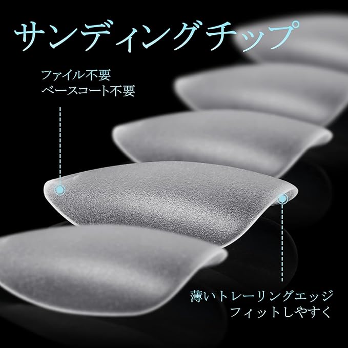 【サンディングチップ】既に表面にサンディングをしてあるのと同じような細かい凹凸がついたネイルチップです。ネイルチップの上にジェルを塗る時にしなければならない面倒なサンディングの手間が省けて、そのままジェルを塗っても剥がれできません。また、チップとジェルも密着を高め、リフトにくいチップ製作が可能です。