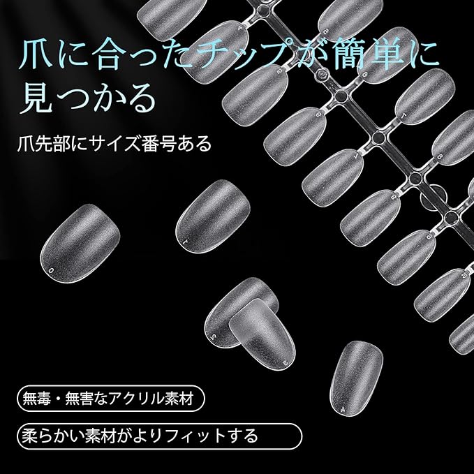 【ナチュラルフィット】このソフトネイルチップは、「薄いトレーリングエッジ、厚いリーディングエッジ」を特徴としています。薄いトレーリングエッジはネイルチップ全体が爪にフィットしやすくなり、不快感を感じなくなります。また、透明なネイルチップは通気性が高く、指に負担をかけません。厚みのあるフロントエッジにより、折れたり曲がったりしにくく、長持ちです。