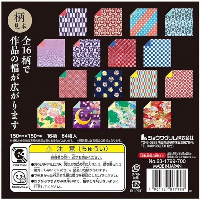 あたたかみのあるしっかりとした紙質で作品の幅が広がる両面千代紙。全16柄入りで様々な作品がつくれる。