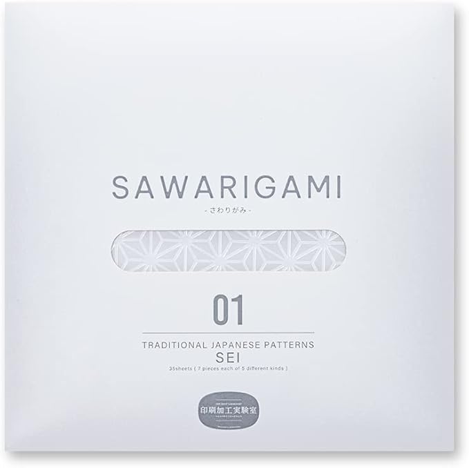 " 特徴:独自の特殊印刷技術「さわりがみ加工」によって紙の表面にざらざらとした凹凸を生みだした、触り心地のある折り紙「SAWARIGAMI」。 透明な特殊ニスを使用しているため、ぱっと見は真っ白な折り紙に見えますが、光の加減で上品な和柄模様が浮かび上がります。 色や模様といった視覚的な変化を楽しむ従来の折り紙に対して、触り心地という触覚要素が加わった、新感覚の折り紙です。"