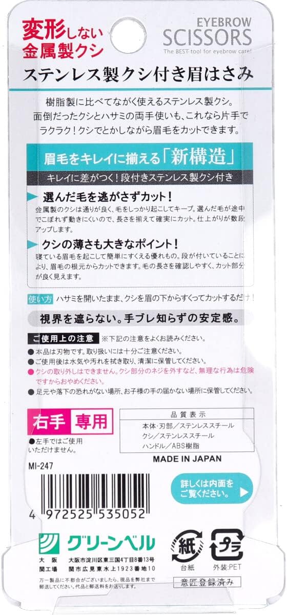 ●キレイに差がつく!段付きステンレス製クシ付き眉はさみ!●眉毛のお手入れこれ1本!思い通りに切れて使いやすい形状、ねらい通りにカットできます。●眉毛をきれいに揃える段付き精密クシ部。0.5mmのステンレス材を使用した段付きで精密なクシ部は眉毛にフィットします。●クシ部とカット部分が密着しているから眉毛が短めにカットできます。●クシとハサミの両手使いも、これなら片手でラクラク。クシでとかしながら眉毛をカットできます。切りすぎません。●クシと刃がステンレス製だから耐久性抜群です。●眉毛の根元にフィットしやすく、狙った部分を逃さずカットできます。●視界を遮らない、手ブレ知らずの安定感です。●右手専用です。(左手ではご使用いただけません。)