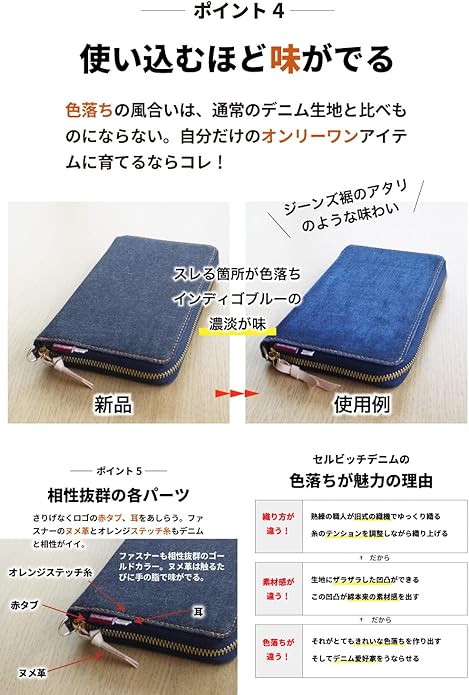 「セルビッチデニム」といえば、ミミ(セルビッチ=耳)。その「耳」と「ロゴの赤タブ」をさりげなくあしらい、ヴィンテージデニム感が高いことも嬉しいポイント。ヴィンテージの王様的存在でジーンズの醍醐味を言われる「色落ち」の風合いや表情は一般的なデニム生地とは比べものにならない。。摩擦でデニムが最高の色落ちをして自分だけのオンリーワンアイテムに育つのも魅力のひとつ。 通常ありがちなチープ素材の通帳ケース・通帳入れは使い込むと使用感がハンパなくすぐボロボロなりますが、当商品は、デニム素材のスレ感で逆に味が出て愛着がUP。 とく使用する「セルビッチデニム」の経年変化の風合いはよくあるデニム素材とはモノが違う。