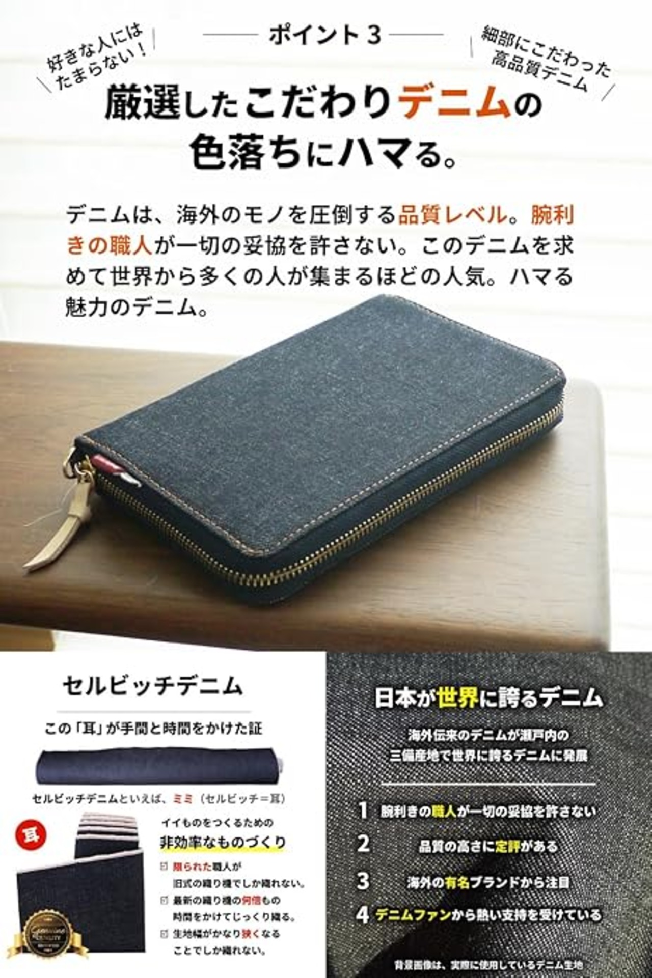 【デニム好きには、たまらない】あなただけの色落ちを楽しむ。通帳ケース スキミング防止機能 ▶︎ 大切なカード情報を守る。じゃばら部分を含めたファスナー内のポケットには、スキミング防止素材を内蔵。 大容量でも見やすい ▶︎ ケースに入れたままの通帳収納10ポケット、カード収納16ポケットでスッキリまとまる。お札も折らずに入る。 注目を浴びる日本製デニムから「昔ながらの製法」のセルビッチデニムを使用したカードケース ▶︎この高品質なデニム生地は、海外のモノを圧倒する品質レベル。腕利きの職人が一切の妥協を許さない。 使い込むほど味が出る ▶︎色落ちの風合いは、一般的なデニム生地と比べものにならない。自分だけのオンリーワンに育てるならコレ。 付属リングでカギも収納 ▶︎小さめのカギなら、付属リングにつけて収納できて持ち運びがシンプルに。 あると便利なDカン ▶︎ 大きめのスマートキーもDカンにつければ無くさず持ち運べる 相性抜群の各パーツ ▶︎さりげなくロゴの赤タブや、耳をあしらう。ファスナーのヌメ革とオレンジのステッチ糸もデニムと相性がイイ。 ■サイズ、横 約19cm 縦 約12.5cm 厚さ 約2.5cm ■重量、約190g