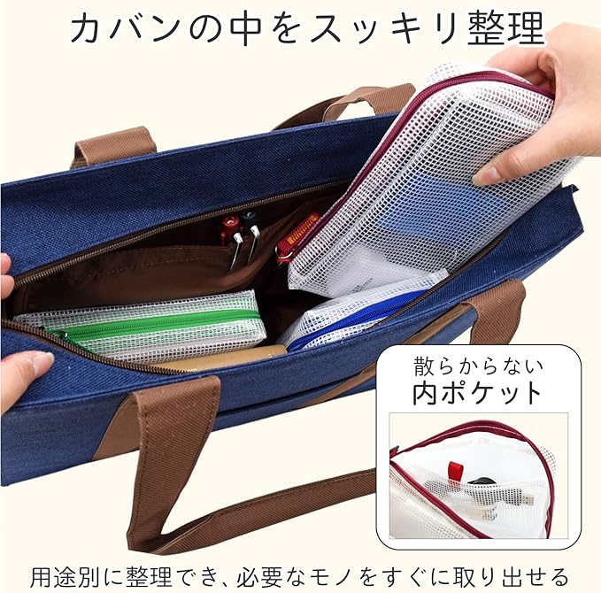小分けに便利な内ポケット、中身の表示や宛先を書いたカードを挟める表示ポケット付き
