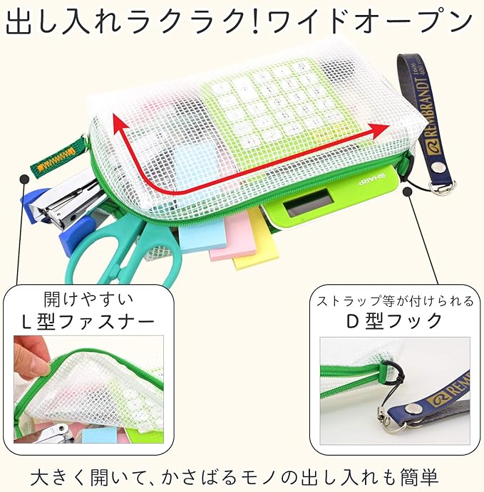 【特長3】収納物の小分けに便利な内ポケット、タグやストラップを付けられるD環付き