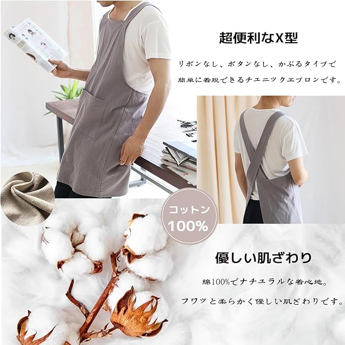 【多目的に活躍】エプロンは家庭生活の多くの側面に対応しています。料理の際には飛び散る油や汚れから身を守るために利用できるほか、家事、手芸、園芸など、さまざまな活動で衣服を清潔に保つのに役立ちます。その用途は幅広く、快適な作業環境を提供します。