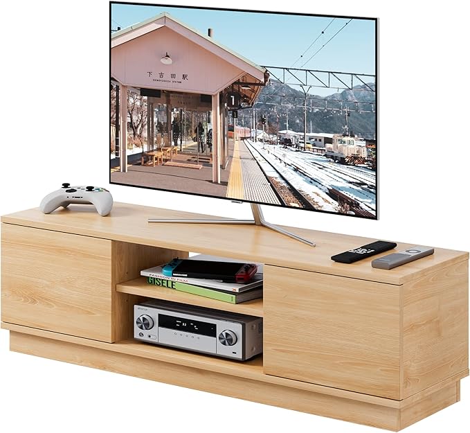 「収納付きテレビ台」このシンプルなテレビ台は見た目に反して、驚くほどの収納力を持っています。扉付きのデザインは引き出しのデザインより、収納容量はもっと多く、組み立ても簡単で、わずかな収納スペースも無駄にしません。中間の棚板は約48cmの幅広で、上下2層にデザインされているため、限られたスペースに2台の機器を共に置くことができます。また、中間の棚板は3段階高さ調節できるため、収納物の高さに合わせて調節が可能で、さまざまな用途に対応します。背板のない仕様は、通気性がよく、配線収納にも便利です。