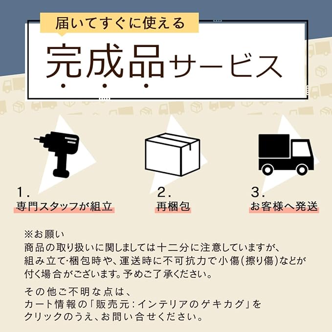■完成品について■ 1.商品の梱包にはリサイクル段ボールを使用しています。2.ご注文をお受けしてからすぐに組み立てを行う為、ご注文後のキャンセルは原則お受け致しておりません。3.組み立て作業完了後の発送になりますので翌日お届け対象外商品です。4.商品のお届けは玄関先までとなります。