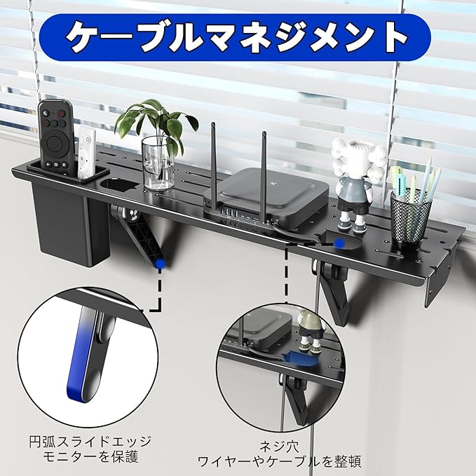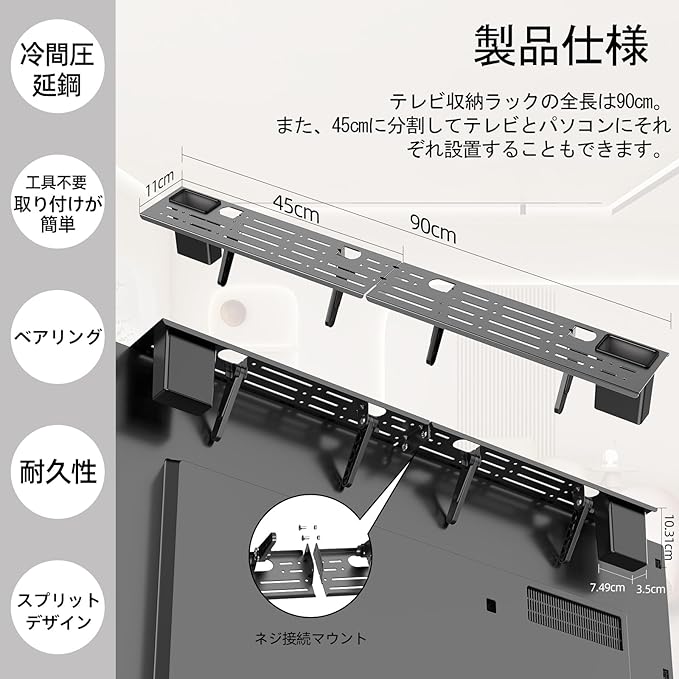 【用途】45cmユニット2つに分けて単独使用することも、組み合わせて90cmユニットとして使用することも可能です。無線スピーカー、ゲームコンソール、メディアボックス、リモコン、写真、植物などの設置に最適です。ただし、曲面ディスプレイには対応していません。耐荷重は6kgです。