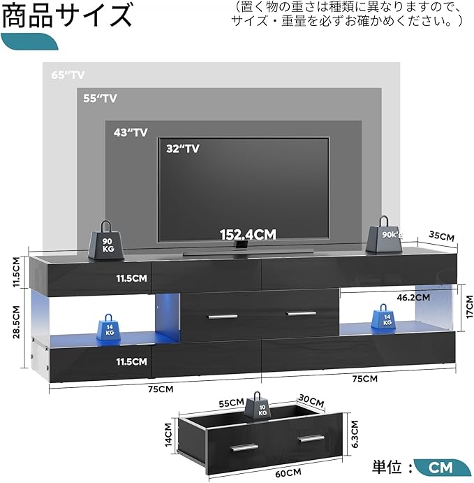 【細部までこだわった安心設計のテレビボード】スムーズに開閉できる引き出しレール、丸型取っ手、床を傷つけにくい脚部など、細部まで機能美を追求。耐荷重約90kgの頑丈なテレビ台は、大型テレビもしっかり支えます。転倒防止金具2個付きで、お子様やペットのいるご家庭にも安心です。
