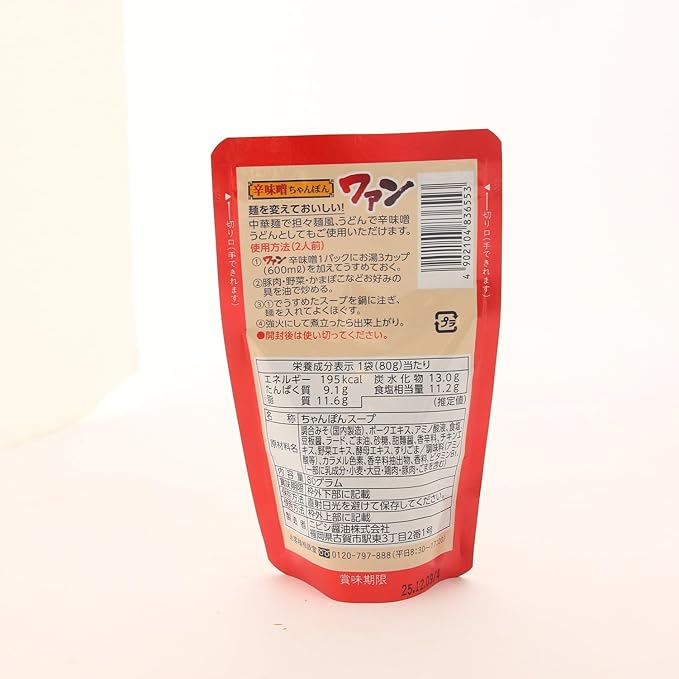 味噌味のピリ辛タイプのワァン。 ちゃんぽんスープとしてはもちろん他の麺や炒め物にもお使い頂けます。 ※2人前用