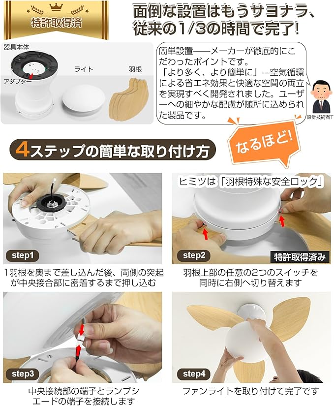 【特許取得のデザイン・工事不要!取付簡単】本製品は特許登録済みの独自設計により、プレードをカチッとはめるだけで、たった一人でサッと設置完了。他社製品のように業者を呼んで1時間待つ必要はありません!面倒な設置が従来の1/3の時間に!さらに、圧迫感ゼロの薄型設計(65 65 25cm)で狭い空間にもすっきり収まり、リモコンホルダー付きで便利さも抜群。「時間」「手間」「コスト」を全て削減した革命的な商品です!