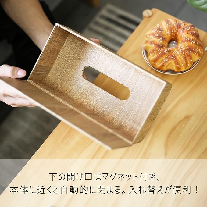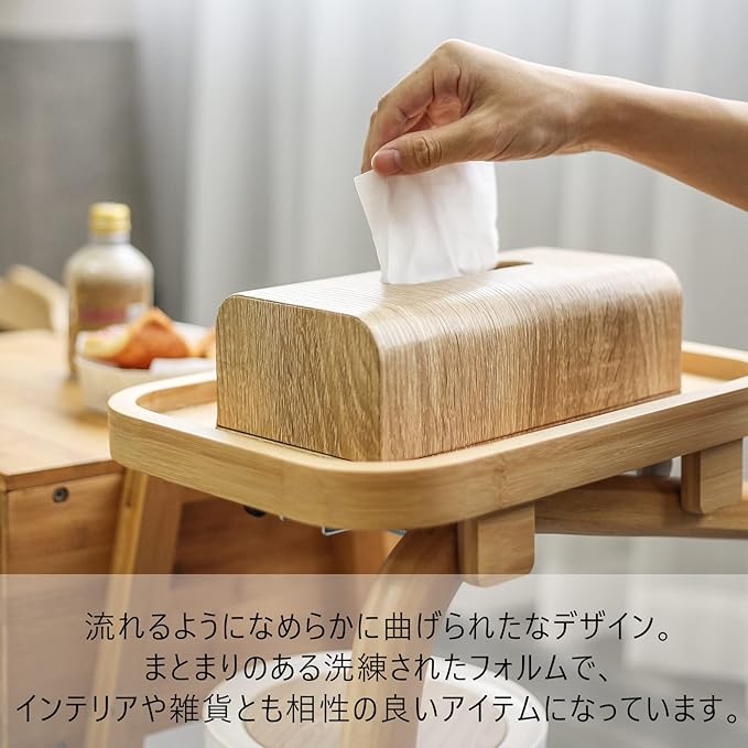 【洗練されたシンプルデザイン】美しい木目で市販の箱ティッシュの柄を隠してインテリアになじむデザインにしました。流れるようになめらかに曲げられたなデザイン。まとまりのある洗練されたフォルムで、インテリアや雑貨とも相性の良いアイテムになっています。