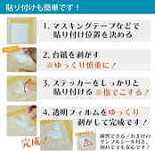 【カッティングステッカーの貼り方】 1. 貼る場所の汚れをとり、キレイにします。2. 台紙を剥がします。その際に透明フィルムにステッカーが全てくっついていないといけません。3. ステッカーのついた透明フィルムごと貼り付けます。4. スキージやヘラ・定規などで中央から外側に向けて圧着していきます。5. ゆっくりと透明フィルムだけを剥がせば完了です。