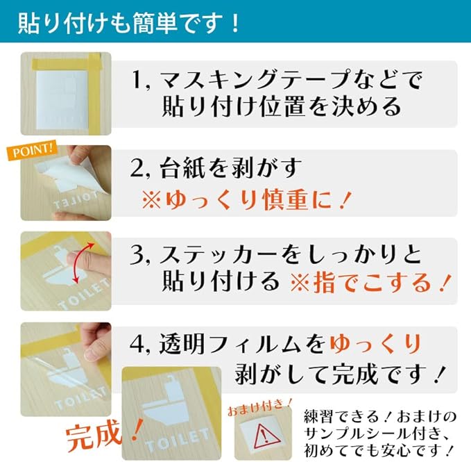 【貼れる素材・貼れない素材】貼れる素材:ガラス、金属、プラスチックなどツルツルした面に貼ることができます。貼れない素材:木材やザラザラの壁紙、スポンジやコンクリートなど凸凹のある場所には貼れません。※同封のサンプルステッカーでお試しの上、貼り付けて下さい。