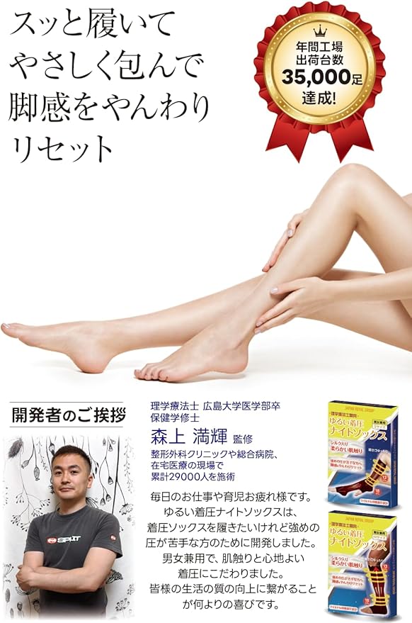 ✅ポイント:①レーヨンにシルクを編み込んだ柔らかい肌触りとぬくもりで穏やかに眠りへ。②ゆるめの圧とゆったりとした履き口の編み込みで眠りを妨げない。③現役理学療法士が国内有数の靴下専門メーカーとタッグを組んで開発。
