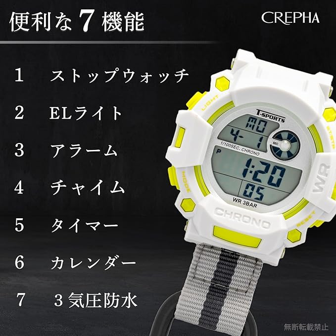 機能:ストップウォッチ、アラーム、チャイム、カレンダー、12/24時間表示切替、ELライト