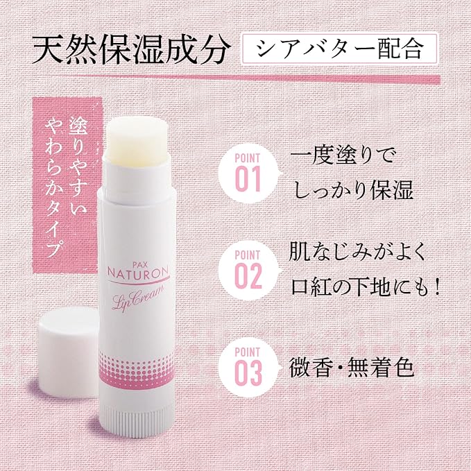 天然保湿成分シアバターを配合したリップクリームです。寒さや強い日差し、エアコンなどによる唇の乾燥や荒れを防いで、うるおいを保ちます。口紅の下地として大変使いやすい無着色タイプです。