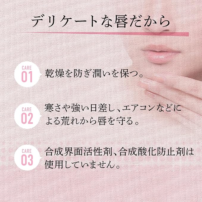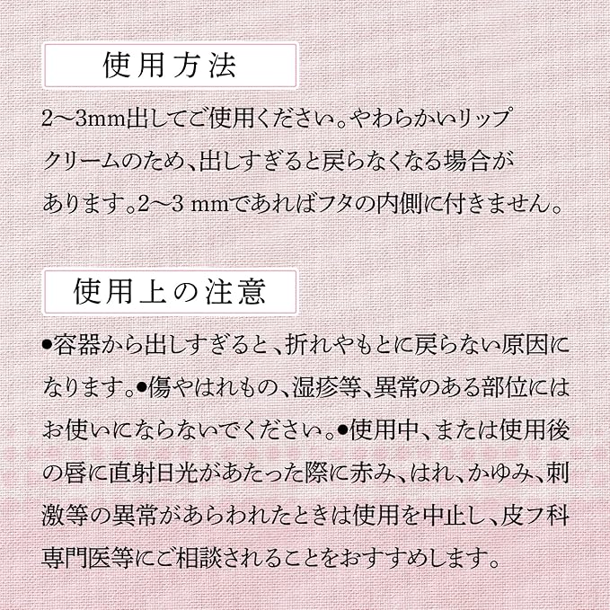シアバター配合で一度塗でもしっかり保湿。合成界面活性剤合成酸化防止剤は使用しておらず、塗りやすいやわらかタイプなのでいつでも手軽に保湿できます。※軟らかいリップクリームのため、出しすぎると戻らなくなる場合があります。