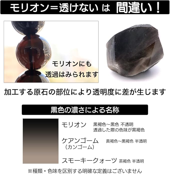 モリオンは黒水晶であるため、鉱石の性質上、強い光を当てると透過します。モリオンは色味が黒色で不透明、透過した際の色味が黒褐色のものをモリオンと言います。ケアンゴームやスモーキークォーツは透明感があり、色味が茶褐色のものを指します。