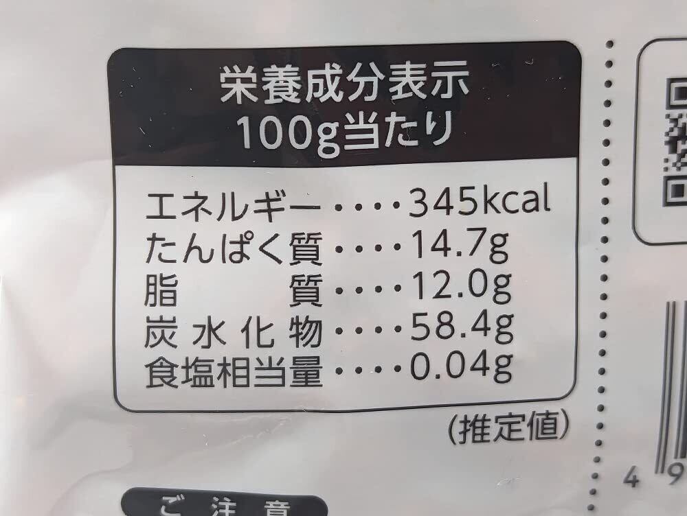 栄養成分: 100g当たり ●エネルギー:345kcal ●たんぱく質:14.7g ●脂質:12.0g ●炭水化物:58.4g ●食塩相当量:0.04g