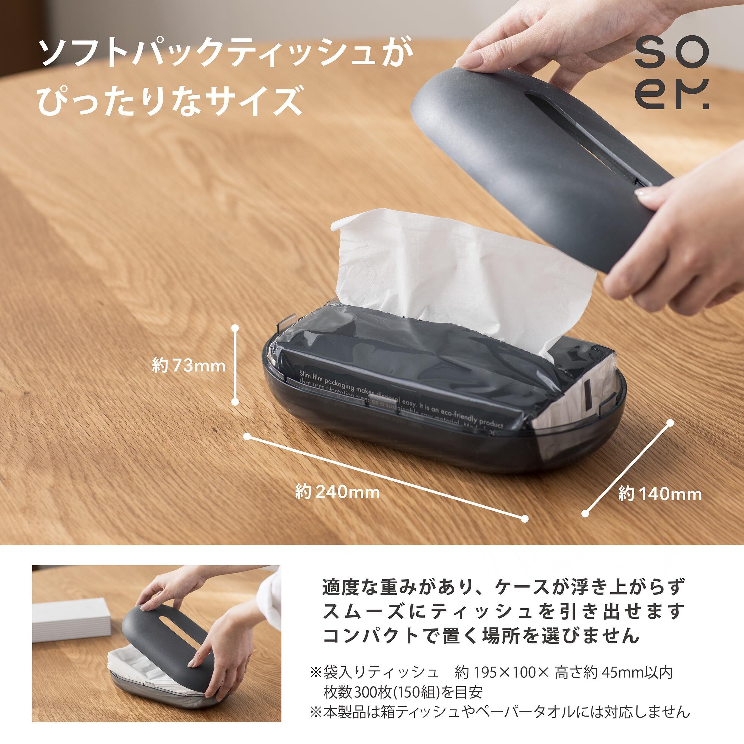 【ソフトパックティッシュがぴったりのサイズ】スリムなソフトパックティッシュにぴったりのケース。適度な重みがあり、ケースが浮き上がらずスムーズにティッシュを引き出せます。コンパクトなサイズ感は置く場所を選びません。